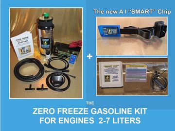 For colder climates, the Zero Freeze gasoline model is needed for all gas engines from 2 to 7 liters. This model is equipped with an internal heater powered by a micro processor that keeps the reservoir above 45°F year round. It cycles the heater on and off to keep the energy consumption at only 0.4 amps over a 24 hour period when outside temperatures drop to minus 20°F. This kit comes with our new fuel management chip that plugs into the OBD port and needs no programming.